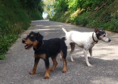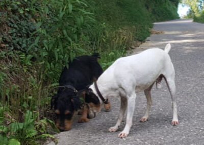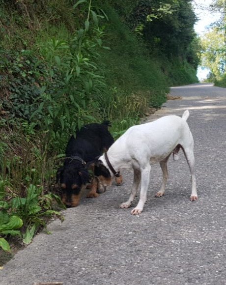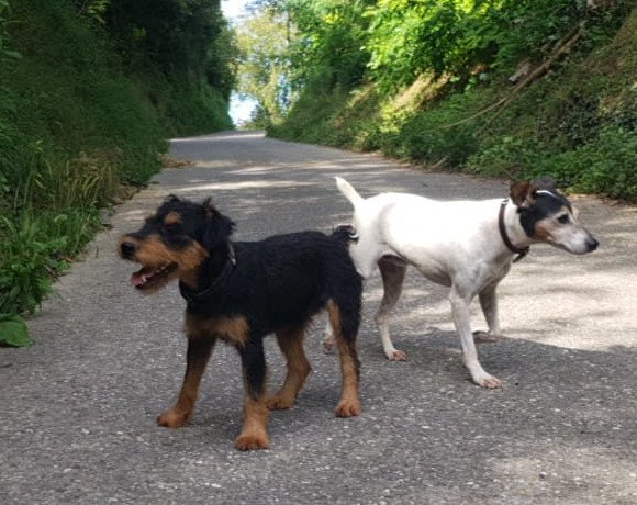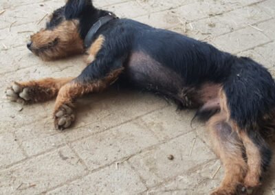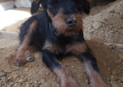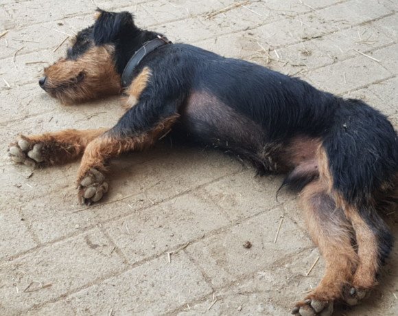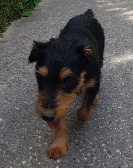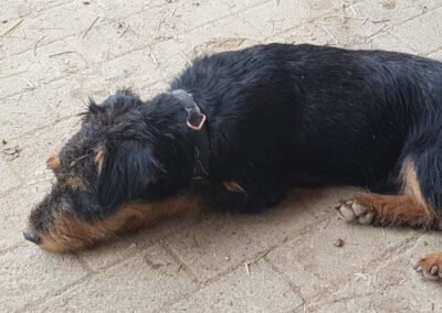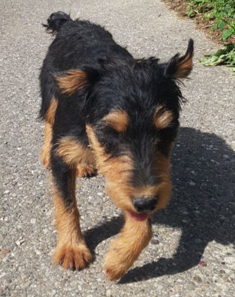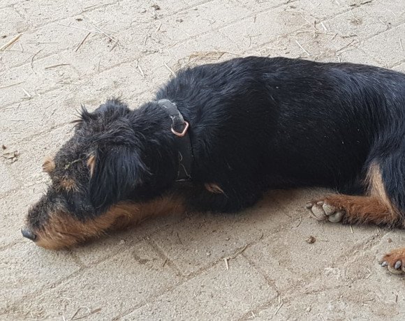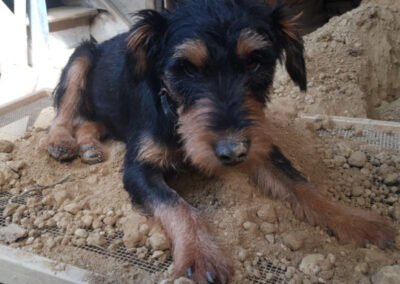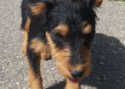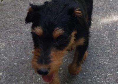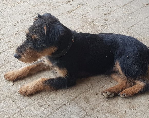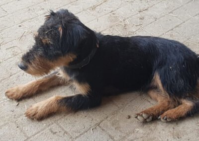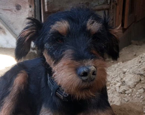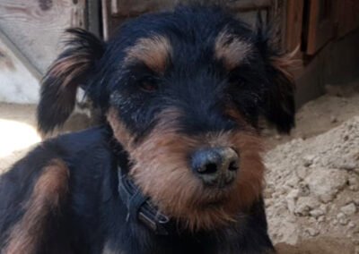 Dino hatte das große Glück, vor kurzem zu seiner Pflegefamilie nach Deutschland reisen zu dürfen – und hier zeigt er sich von seiner allerbesten Seite. Er ist ein sehr intelligenter Hund, der Neues schnell lernt und von Anfang an stubenrein war. Mit dem vorhandenen Rüden im Haushalt versteht er sich gut, auch Kinder im standfesten Alter kennt er bereits und kommt gut mit ihnen zurecht. Katzen oder Kleintiere sollten jedoch nicht in seinem neuen Zuhause leben, da Dino diese am liebsten jagen möchte. Als typischer Terrier bringt er eine gute Portion Dickkopf mit, was ihn gleichzeitig humorvoll, quirlig und liebenswert macht. Er braucht eine klare, konsequente Führung, liebt aber ebenso das Spielen mit dem Ball und genießt gemütliche Kuschelmomente – nachts möchte er dann allerdings seine Ruhe haben. Besonders glücklich ist Dino draußen in der Natur: Wiesen, frische Luft und spannende Mauselöcher sind ganz nach seinem Geschmack. Dabei zeigt er sich im Alltag insgesamt unkompliziert und hat keine Probleme mit Autofahrten, Fahrrädern, Joggern oder Motorrädern. Sein Rückruf an der Schleppleine wird aktuell fleißig geübt und verbessert sich von Tag zu Tag. Menschen gegenüber ist er freundlich, nur vor älteren Personen (vor allem vor Männern) zeigt er Unsicherheit und zieht sich lieber zurück. Daher wünscht sich Dino eine aktive Familie mit jüngeren Menschen, die Freude an gemeinsamer Beschäftigung haben und ihm die nötige Sicherheit geben. Ein ländliches Zuhause mit gesichertem Garten, vielen Möglichkeiten zum Schnüffeln und ausreichend Auslauf wäre ein kleiner Traum für ihn. Bei einer tierärztlichen Untersuchung wurde eine fortgeschrittene Degeneration im arthrotischen Sinne im linken Hüftgelenk festgestellt, weshalb er Physiotherapie erhält. Ggfs. wird in naher Zukunft eine Femurkopfhalsresektion notwendig sein. Leider neigt Dino dazu seine Pfoten zu bearbeiten, teilweise so stark, dass sie komplett offen und blutig sind. Damit ihm der starke Juckreiz nicht mehr so zusetzt, bekommt er aktuell ein Antiallergikum und ein Mittel gegen Milben (zweimal im Abstand von 4 Wochen). Mittlerweile wurde sein Futter auf eine andere Proteinquelle (Fisch) umgestellt.