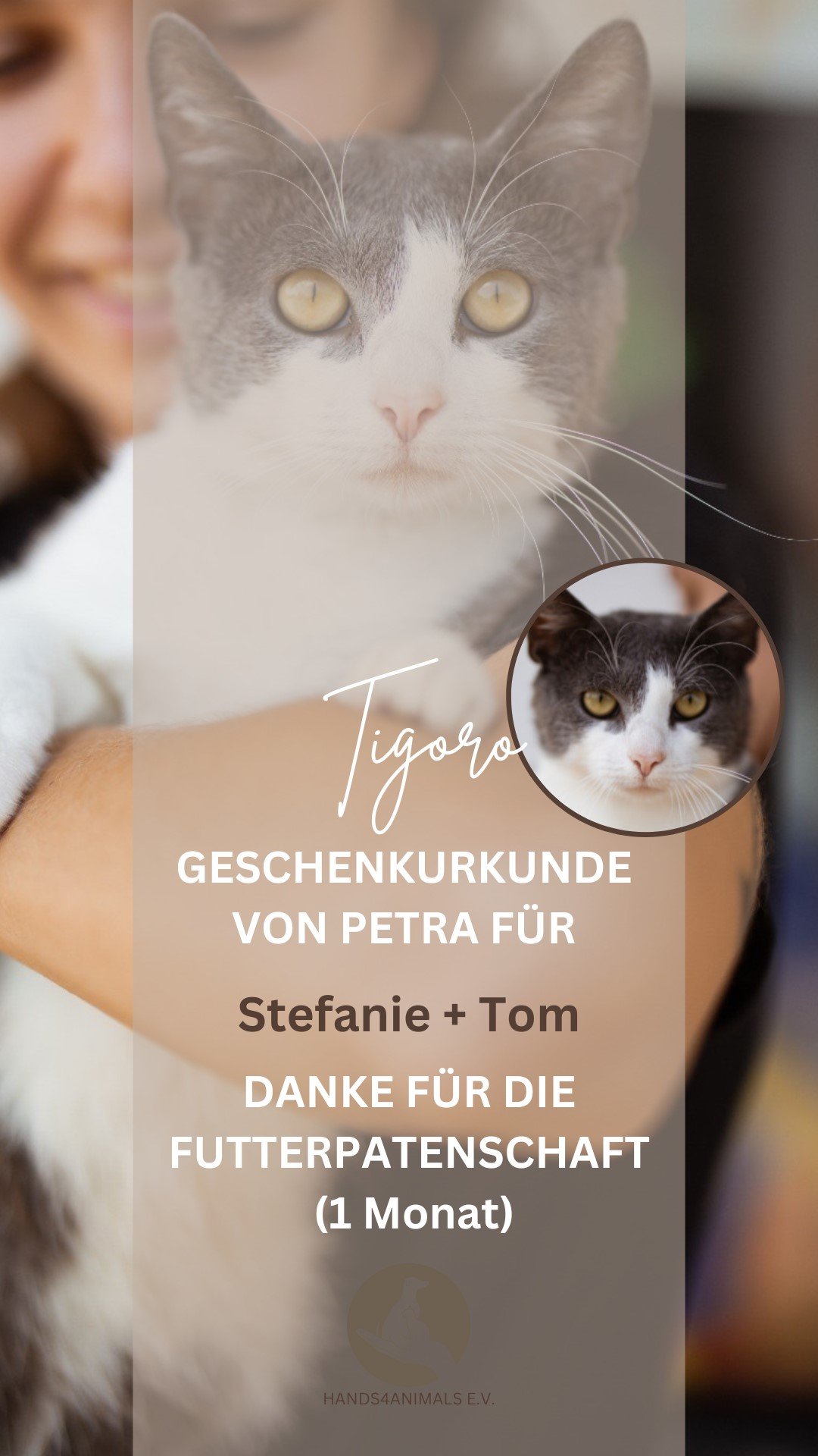 - Besonderheiten: Tigoro ist ein lieber, verschmuster und verspielter Kater. Er wird nur gemeinsam mit einer anderen Katze oder zu einer bereits vorhandenen vermittelt.